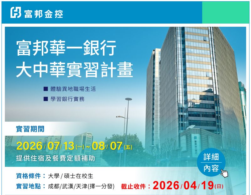 2026年富邦華一銀行暑期實習計劃已正式開放申請,提供住宿及餐費定額補助,敬請協助公告並轉寄予 貴校系同學知悉,本計劃履歷收件至4/19(五)截止,歡迎 貴校系同學踴躍參加甄選。