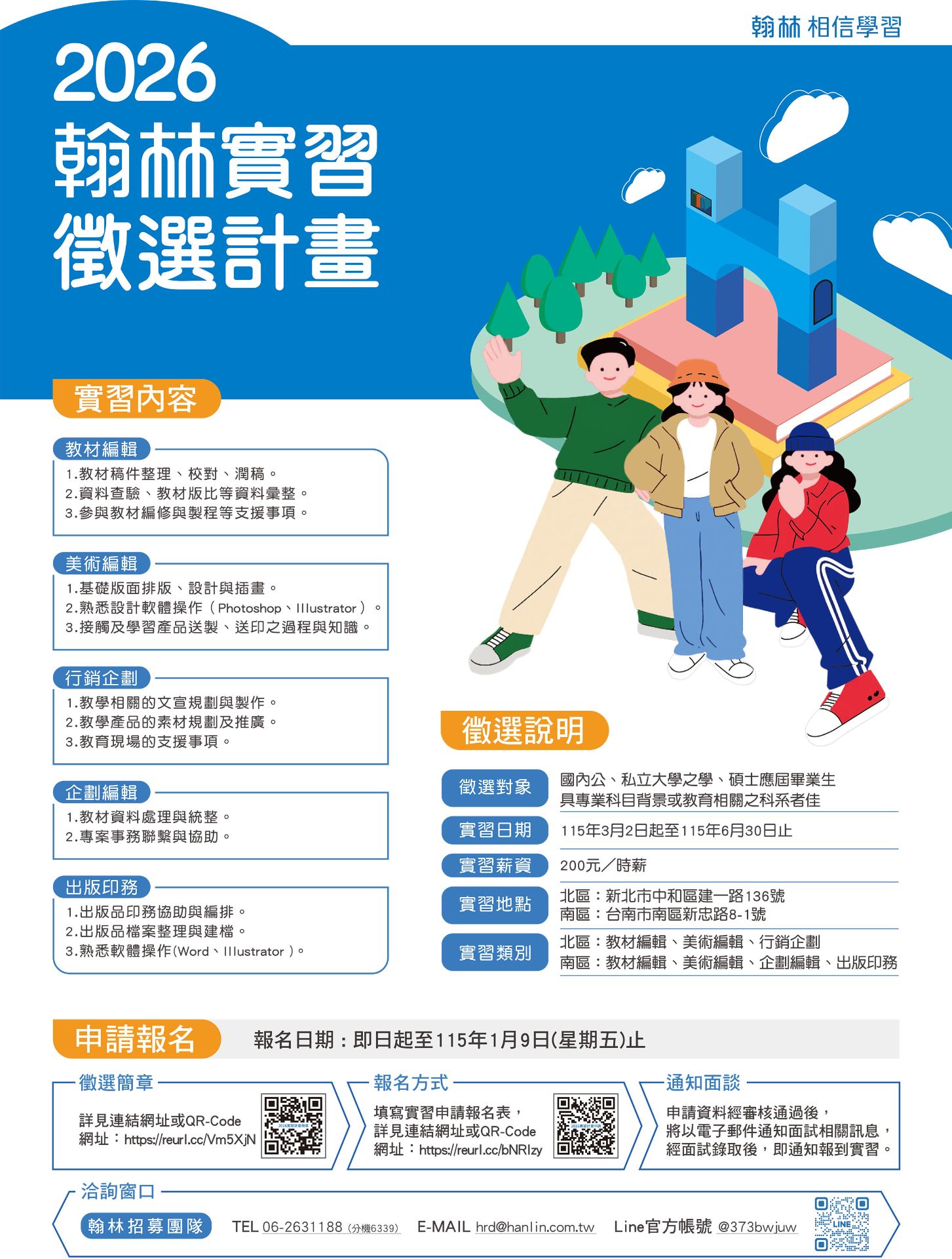 翰林出版事業股份有限公司辦理「2026翰林實習徵選計畫」,本計畫提供學生實際參與出版編輯、教材企劃、行銷推廣、視覺設計、數位內容製作及相關實務之機會,與本次公告之系所專業領域具高度相關,誠摯歡迎符合資格之同學踴躍報名參加。